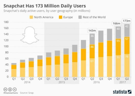 - Snapchat daily users worldwide – 173 million (Statista,2017)