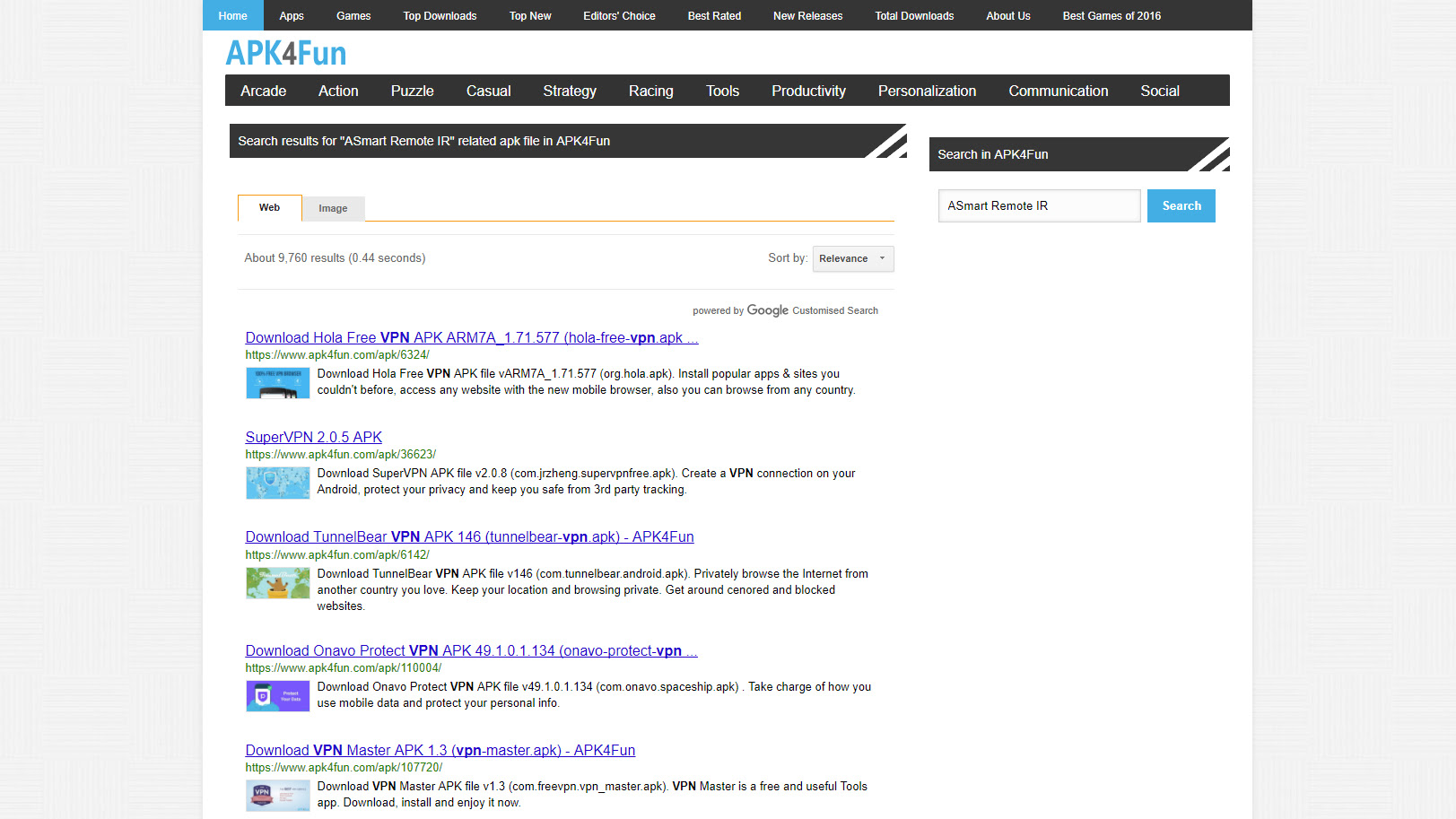 At the time of writing, APK4Fun’s search facilities appeared to be broken. Run by Google Custom Search Engine, this repository lists more than 6,000 results for VPNs, an impressive number. Sadly, you can only access 100 (ed: You can also use the search operator site:www.apk4func.com “VPN” to unearth around 400 VPNs).
