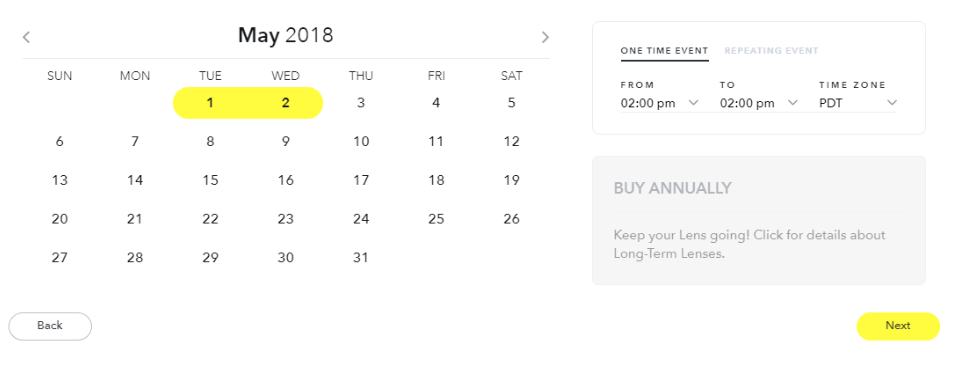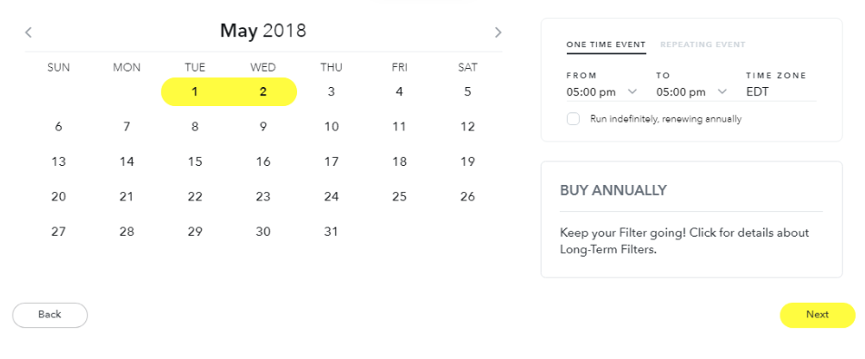 Next, determine when your filter will be available for users to access. You can choose to make it for a single event, spanning at least one day, for a period of time you specifically choose, or you could make it a repeating event (such as turning it on every Sunday, or once a month). If this is for an annual event, you can even set up a recurring annual filter, so it renews every year.