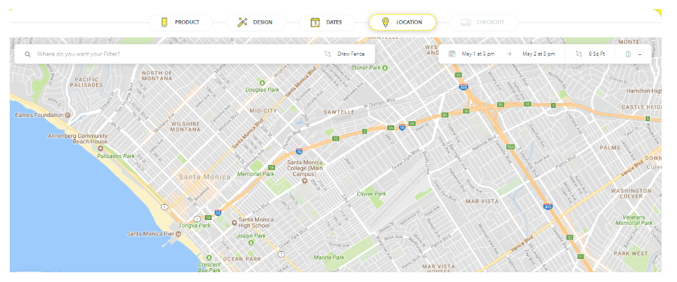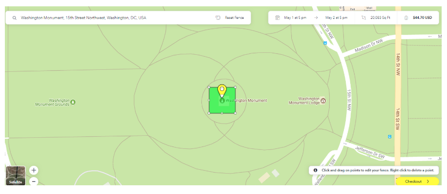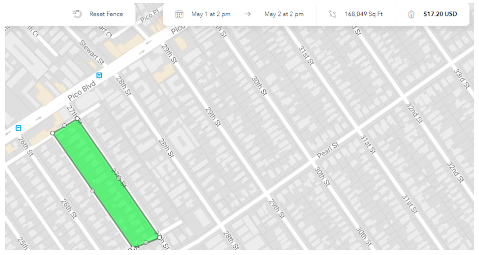 When you’ve selected the date range, you can move on to the location. Here, you can select a specific address or destination, or draw your own “fence.” The cost of your order will increase with the size of the area.