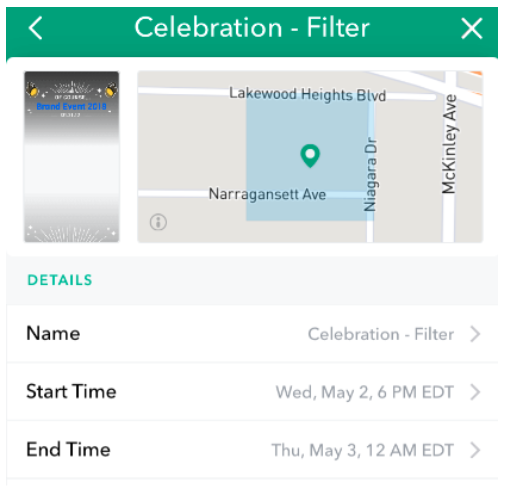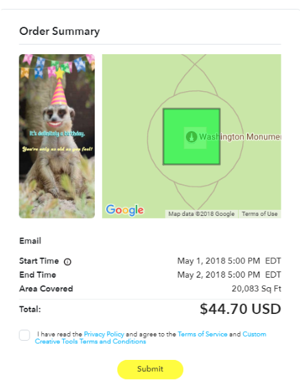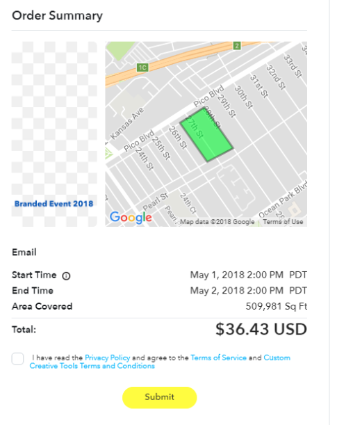 Once you’ve chosen the area for your filter, you’ll get a short recap page that explains exactly what you’re purchasing. This will show you the area you’re targeting, a preview of the filter, the date and time it will be available, and the cost.