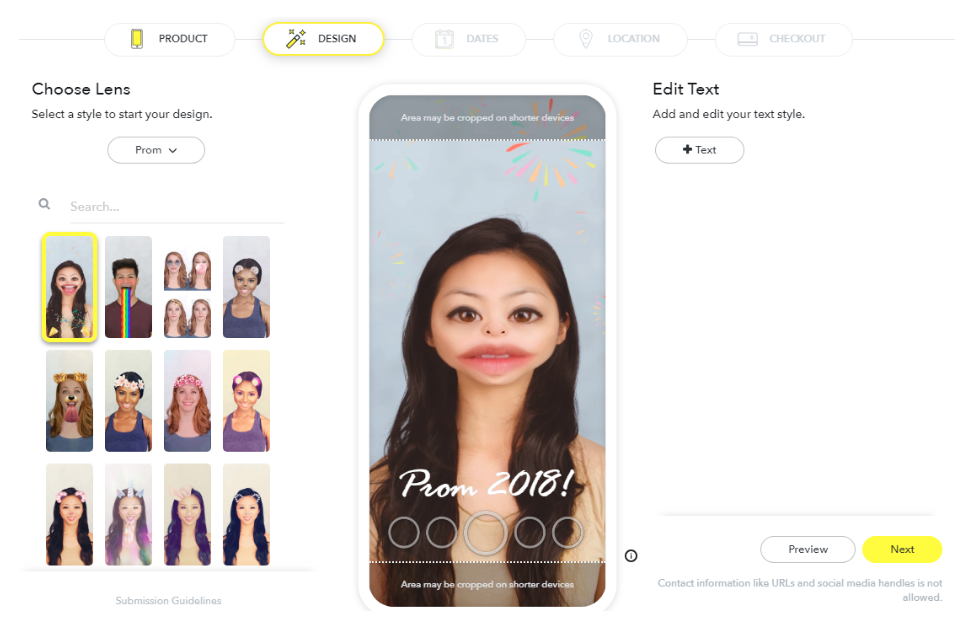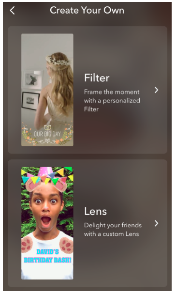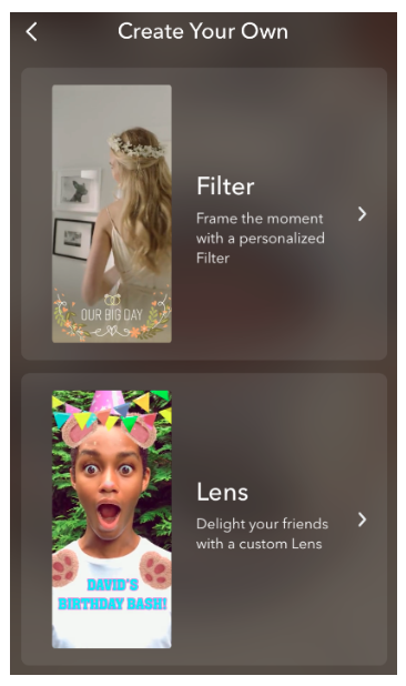 You’ll notice there are significantly fewer options for Snapchat lenses than there are for custom Snapchat filters.