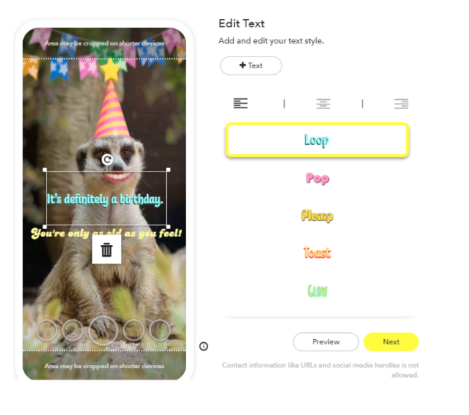 The next step is to add text. Add as much as you want, place it where you want, and choose from several font and color options.