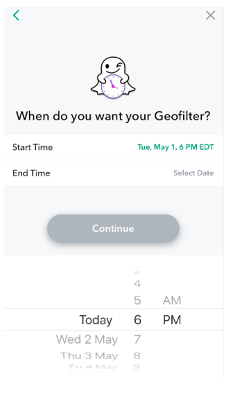 The interface here is fairly straightforward. Your geofilter will be active from a specific start time to a specific end time.