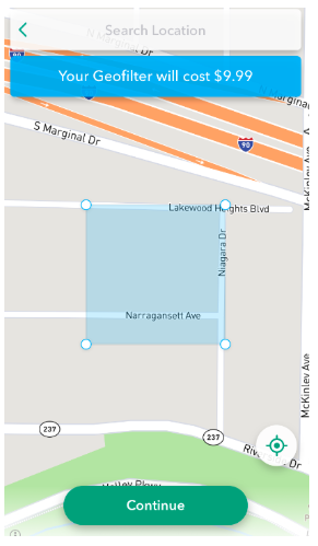 Note that your “fence” can be drawn to cover an area between 20,000 and 50,000,000 square feet. You can also redraw your fence as many times as you like. In the upper-right hand corner, you’ll notice the price of your custom Snapchat filter will change based on the size of your target area.