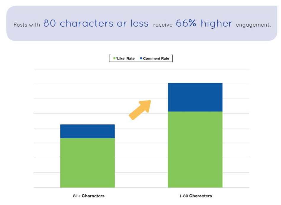 In 2016, BuzzSumo analyzed more than 800 million Facebook posts. Based on their findings, posts with less than 50 characters “were more engaging than long posts.” According to another, more precise study by Jeff Bullas, posts with 80 characters or less receive 66 percent higher engagement: