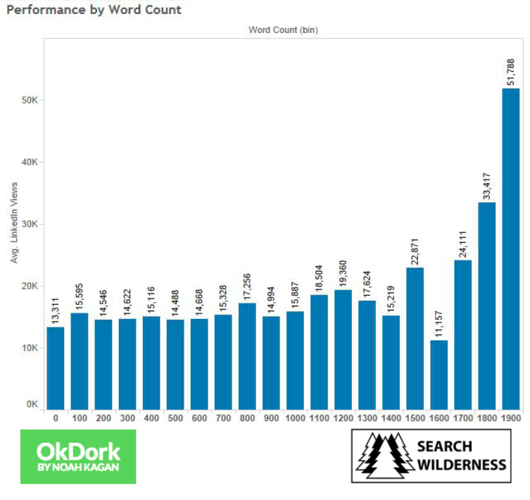 “Posts between 1900 and 2000 words perform the best,” writes Shapiro. “[They] gain the greatest number of post views, LinkedIn likes, LinkedIn comments, and LinkedIn shares.”